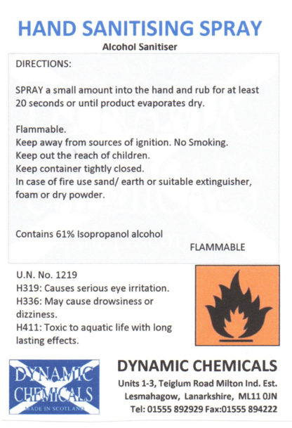 Dynamic Chemical’s antibacterial Alcohol Hand Sanitiser spray is a 61% alcohol liquid skin cleaner for sanitising hands where there are no hand-washing facilities. For use in SPRAY dispensers.