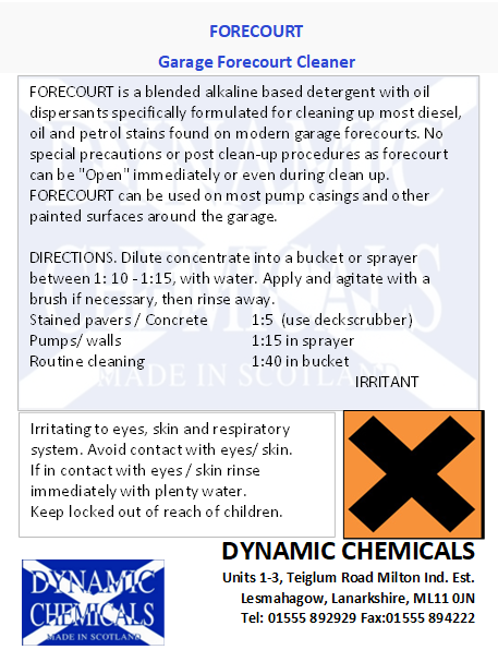 Forecourt is an amazing blend of alkaline detergents, oil dispersants and wetting agents, producing a very effective all round cleaner for problem stain cleaning to regular maintenance cleaning.