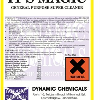 Solvent less General Purpose Super cleaner – Dynamic Chemical’s IT’S MAGIC TOO is a newly developed solvent less hard surface cleaner which contains no Glycol Ethers or Acids.