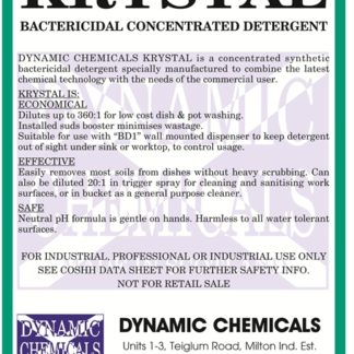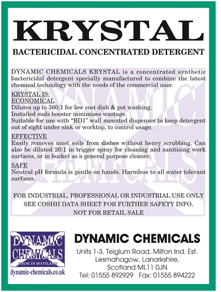 KRYSTAL is a concentrated detergent specially manufactured to combine the latest chemical technology with the needs of the catering professional. Krystal is a viscous detergent in our normal 5 litre container or at the same activity but a thinner consistency in 25 litre drums to make pump dispensing easier. The product can also be supplied with a lemon scent.