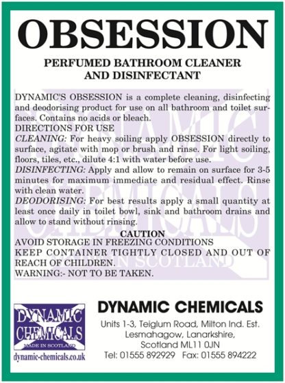 Perfumed Bathroom Cleaner & Disinfectant. Dynamic Chemical’s OBSESSION is a complete cleaning, disinfecting and deodorising product for use on all bathroom and toilet surfaces.