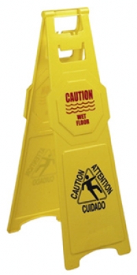 Maximum visibilty standing almost 1 metre high. A-Frame , easel style floor sign, printed both sides with Caution Wet Floor, and Lower grafic of person slipping on Floor, surrounded by tri lingualwarning in English, French and Spanish.