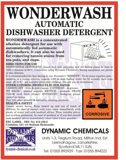 Dynamic Chemical’s WONDERWASH is a ready to use alkaline dishwasher detergent by automatic feed and diluting – operating at temperatures between 55°F – 65°C. Wonderwash contains a tannin removing solvent to banish tea, coffee and water stains. A chlorinated formula is also available.